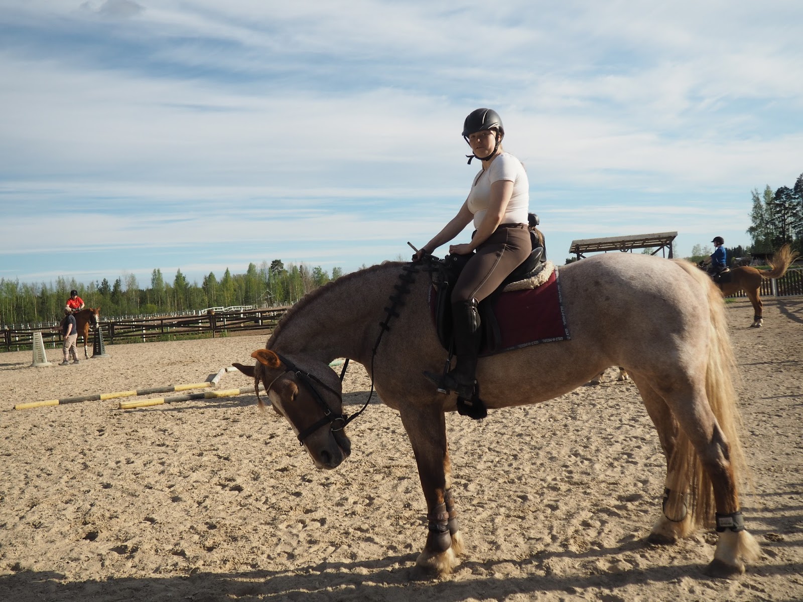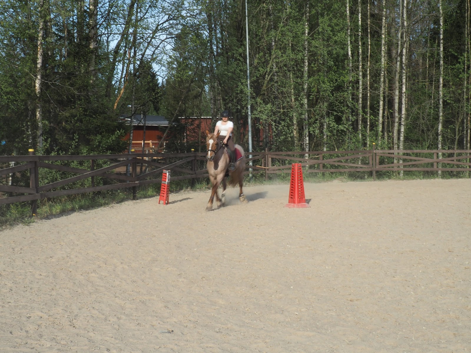 Keskiviikkona menin Nooralla ja se toimi ihan hyvin. Se ei jumittanut ollenkaan vaan liikkui todella mielellään, vaikka olikin hieman hidas. Rata oli kyllä kiva ja helppo muistaa. Menimme jokainen sen kaksi kertaa. Siihen sisältyi mm. Kaksi labyrinttiä, toinen piti mennä käynnissä ja toinen ravissa, sitten oli kaksi erilaista pujottelutehtävää ja sellainen siirtotehtävä, jossa piti siirtää muovinen harmaa kannatin estetolpalta toiselle kättä vaihtaen. ja pysähdys maapuomille niin, että puomi oli hevosen vatsan alla etu- ja takajalkojen välissä, jos hevonen kolautti kavionsa tai astui vaikka kokonaan tai oli astumatta puomin yli, siitä tuli virhe. Sitten oli vielä laukka / raviympyrä, jossa piti tehdä siirtymiset täsmällisesti.